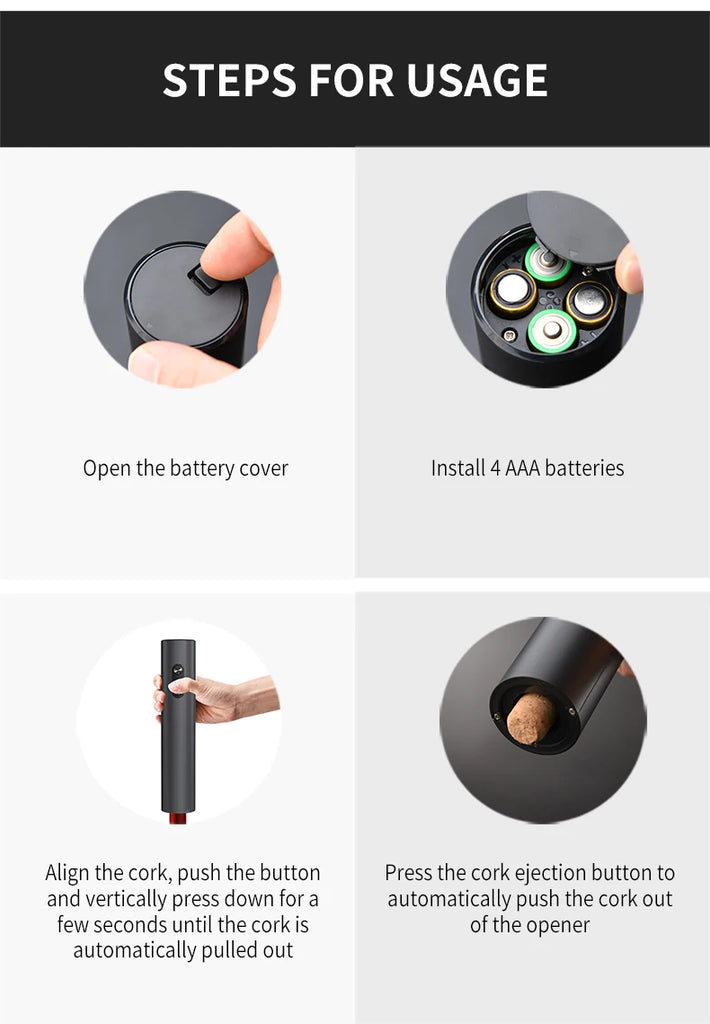 [Poderoso e Durável]: O abridor de vinho elétrico possui uma função de remoção de cortiça poderosa e rápida que pode abrir até 80 garrafas de vinho ao mesmo tempo. 4 baterias necessárias (sem pilhas incluídas).